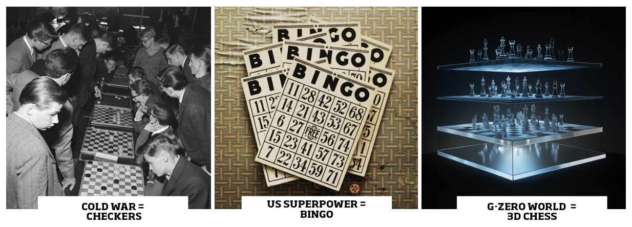 Today, it’s a lot more complicated. The game has become something akin to 3D chess with about 150 players at the table: some play when the pieces are on the top plane, some when they’re on the bottom plane, others all the time, and some never play. The rules are unclear, in flux, and different for different regions and domains. The global landscape has never been more confusing and challenging to navigate.