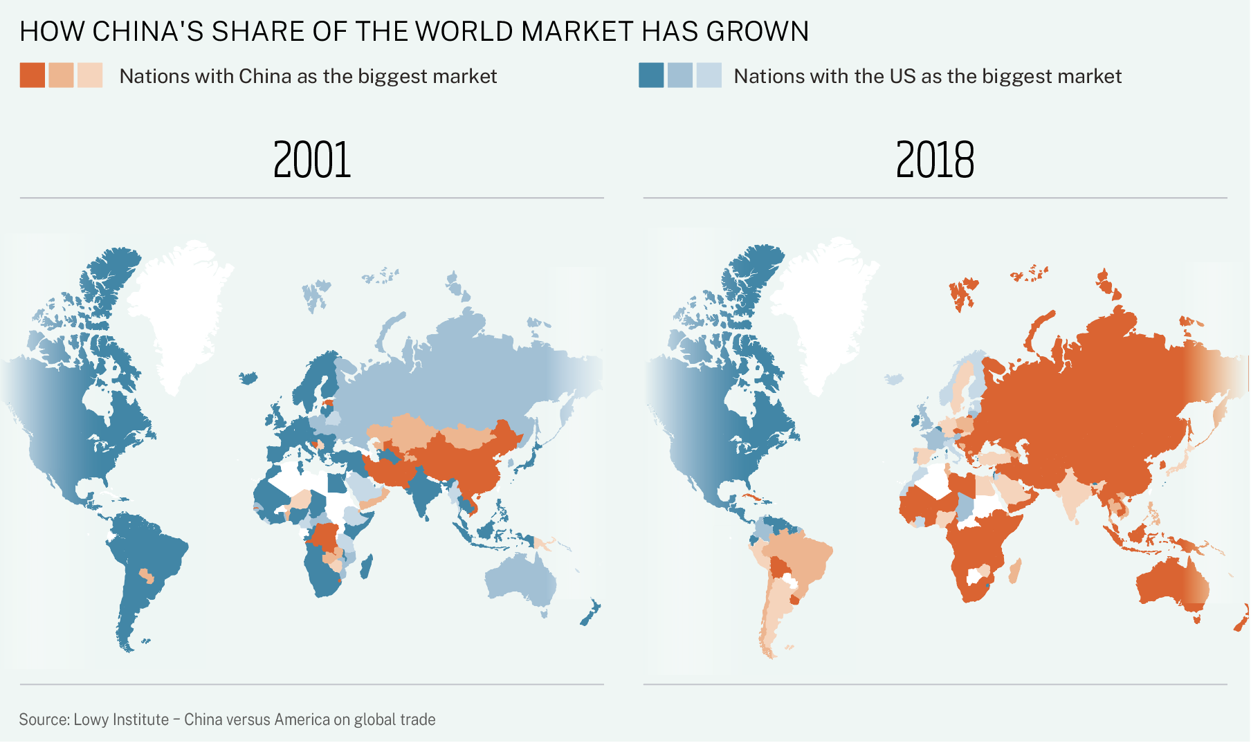 These shifting sands have played out in market influence. In 2001, more countries counted the US as their largest market compared with China. However, by 2018, China had become the dominant buyer for many nations. This shift reflects China’s waxing and America’s waning leverage.