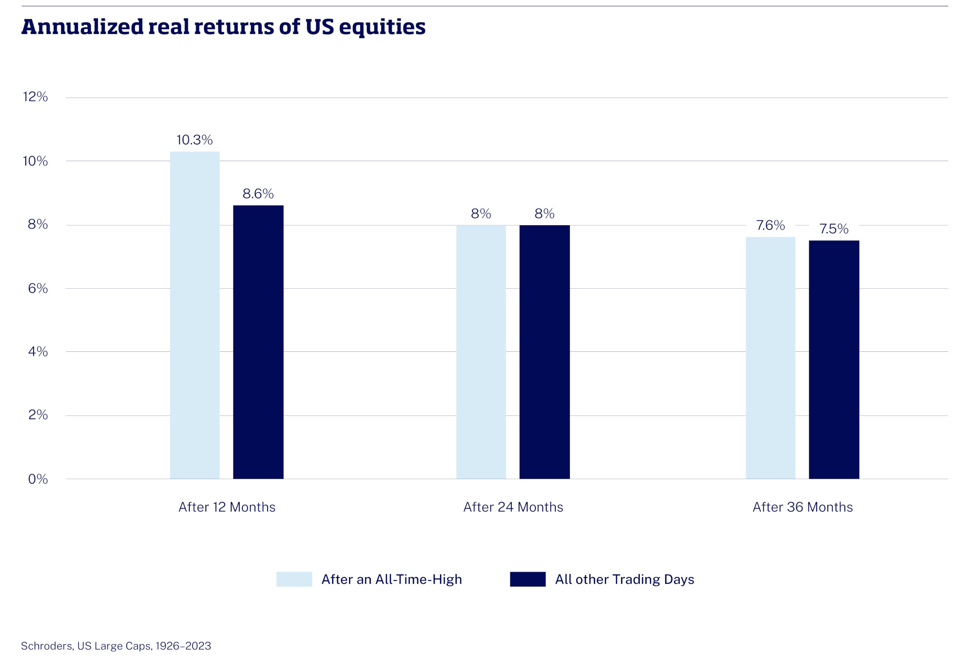 Extending the analysis further back strengthens this conclusion. Using US equity data going back to 1926, the average annual returns one and three years after an all-time high have been higher than the average returns following all other possible entry points (see Chart 4). Contrary to the intuition that new highs should prompt caution or retreat, they have historically coincided with periods of above-average subsequent performance. Similar dynamics can be observed in Swiss equities, based on SPI data since 1987, as well as in global markets as represented by the MSCI World since 1986.