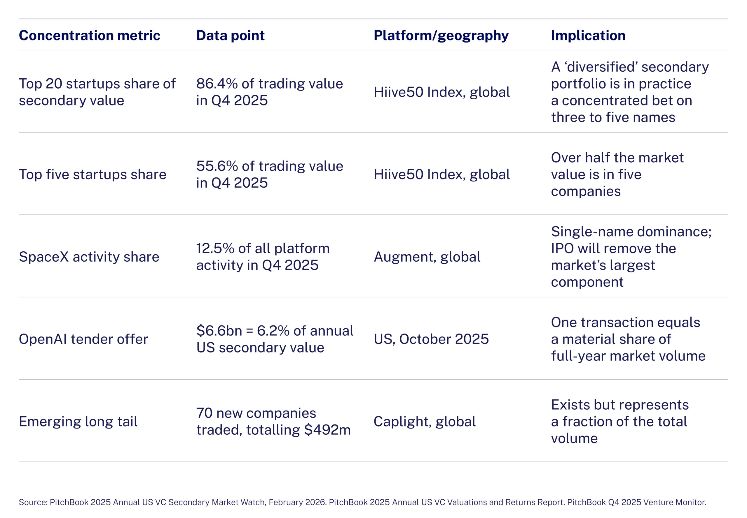 The secondary market’s most underappreciated feature is its extreme concentration. Secondary activity does not distribute across the venture ecosystem; it clusters around perceived winners, replicating venture’s power-law return structure rather than diversifying it. In Q4 2025 (Table 1), the top 20 companies on the Hiive platform accounted for 86.4% of global secondary trading value, with the top five alone at 55.6%. OpenAI’s single October tender offer ($6.6bn) represented 6.2% of full-year US secondary volume. SpaceX was 12.5% of all Augment platform activity in Q4.