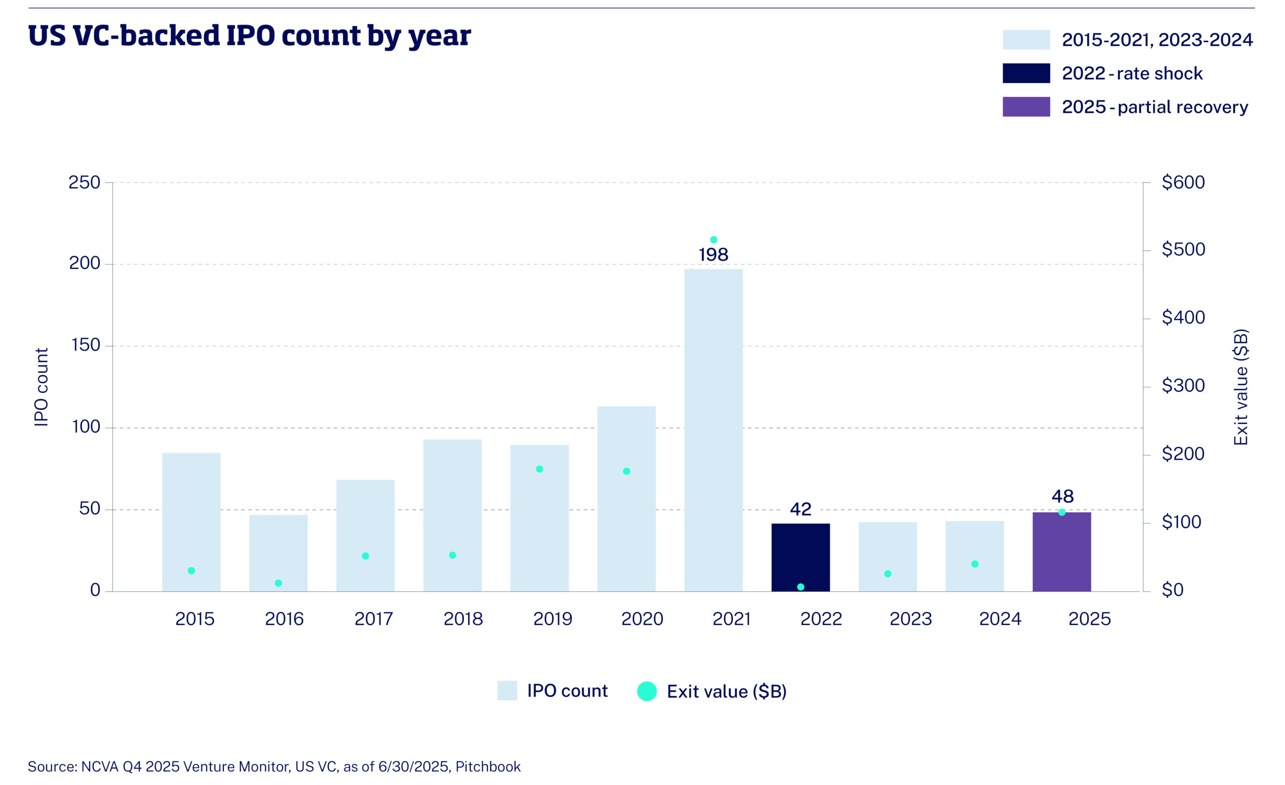 More companies are remaining private for longer. The post-2021 rate cycle compressed public market multiples and collapsed near-term IPO activity. US VC-backed listings fell from 198 in 2021 to 42 in 2022, recovering only modestly to 48 in 2025 (Figure 4). But the rate cycle is only part of the story.