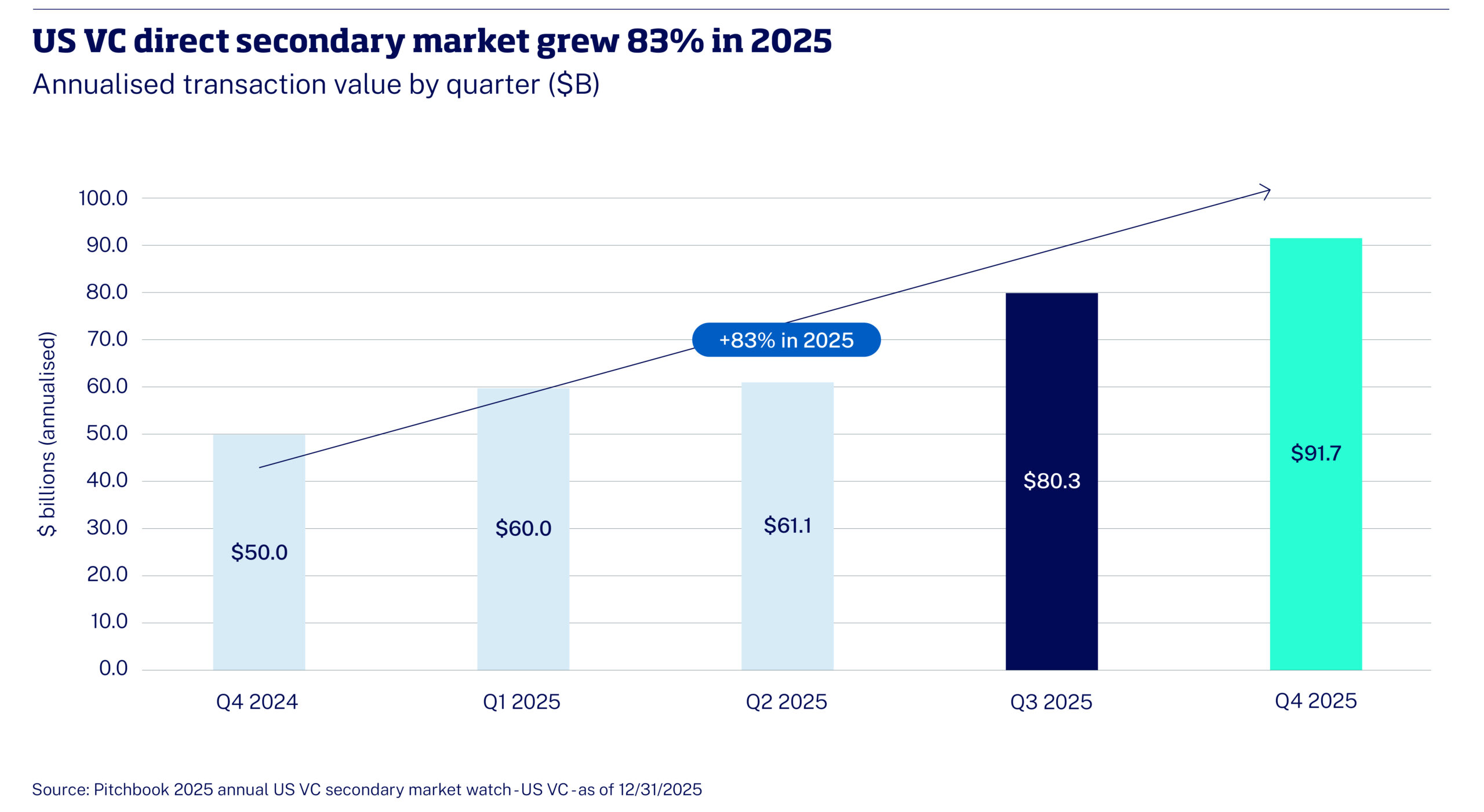 Direct secondaries involve purchasing a stake in an individual company from a founder, employee, or early investor. US direct secondary volume reached a midpoint estimate of $91.7bn in 2025, though PitchBook’s own range spans $62.5bn to $120.9bn, reflecting both market opacity and the outsized weight of a small number of transactions. Access is typically gained through SPVs (special purpose vehicles), which in 2025 had a median raise of $930,000 from nine LPs over just 16 days. This is the closest position to the asset, but often with the least time and the least transparency to validate what is being purchased.