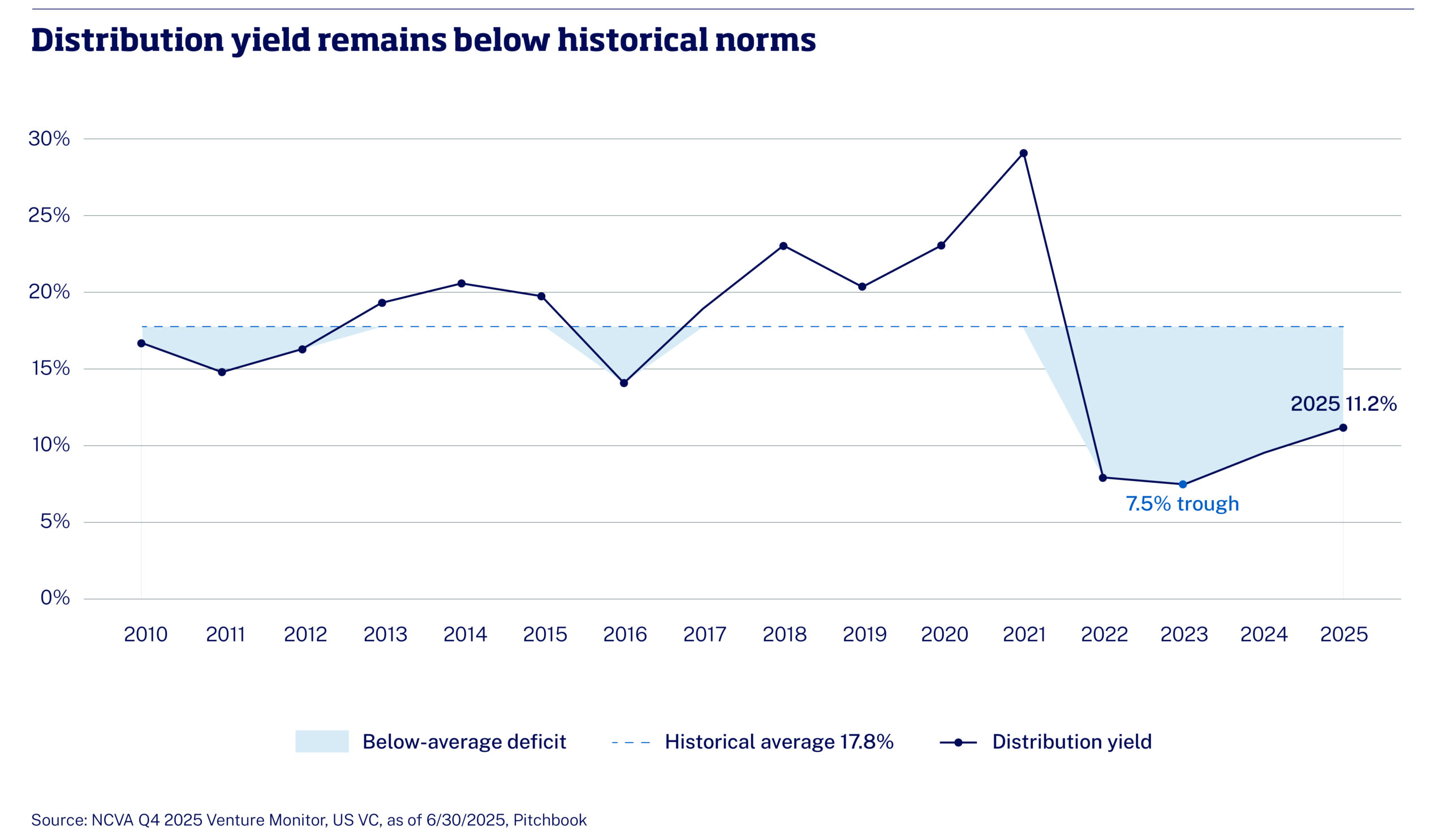 At the LP level, the consequences are now acute. Cash flows to US VC limited partners have been negative by $197bn since 2022, with distribution yield falling to a trough of 7.5% in 2023 against a historical average of 15% (Figure 5). LPs unable to fund new commitments from existing distributions must either reduce venture allocations – only 537 US venture funds closed in 2025, the fewest in a decade – or generate liquidity through secondary sales. The decision to sell is driven by portfolio constraints, not necessarily asset-level conviction.