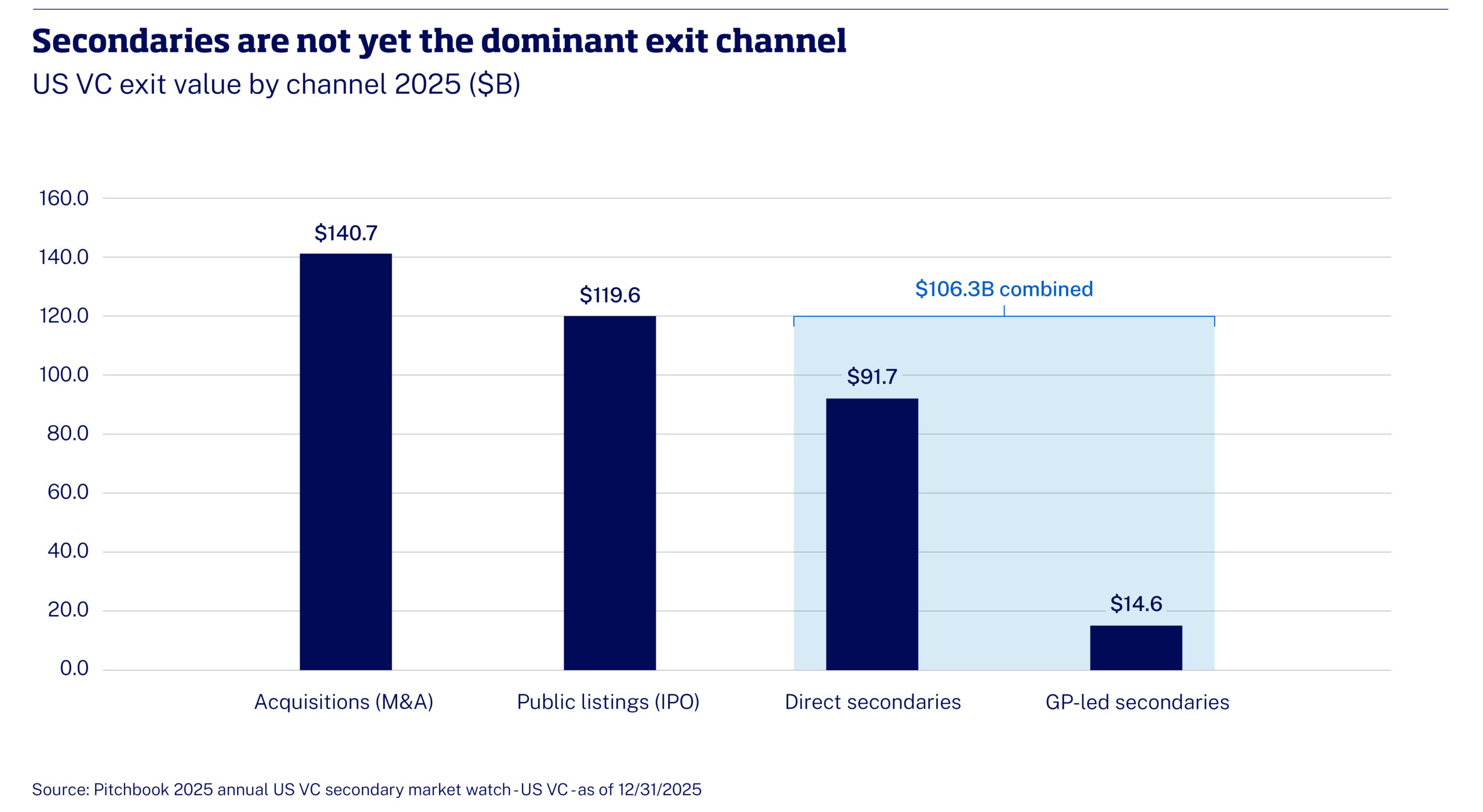 At the fund level, larger vehicles have extended the duration of the problem. US venture capital assets under management grew from under $400bn in 2015 to over $1 trillion in 2025. The exits needed to return this capital have grown proportionally, and nearly half of US unicorns completed their first venture round in 2016 or earlier. GPs are holding assets longer not only because they choose to but because the exit markets described above give them little alternative.