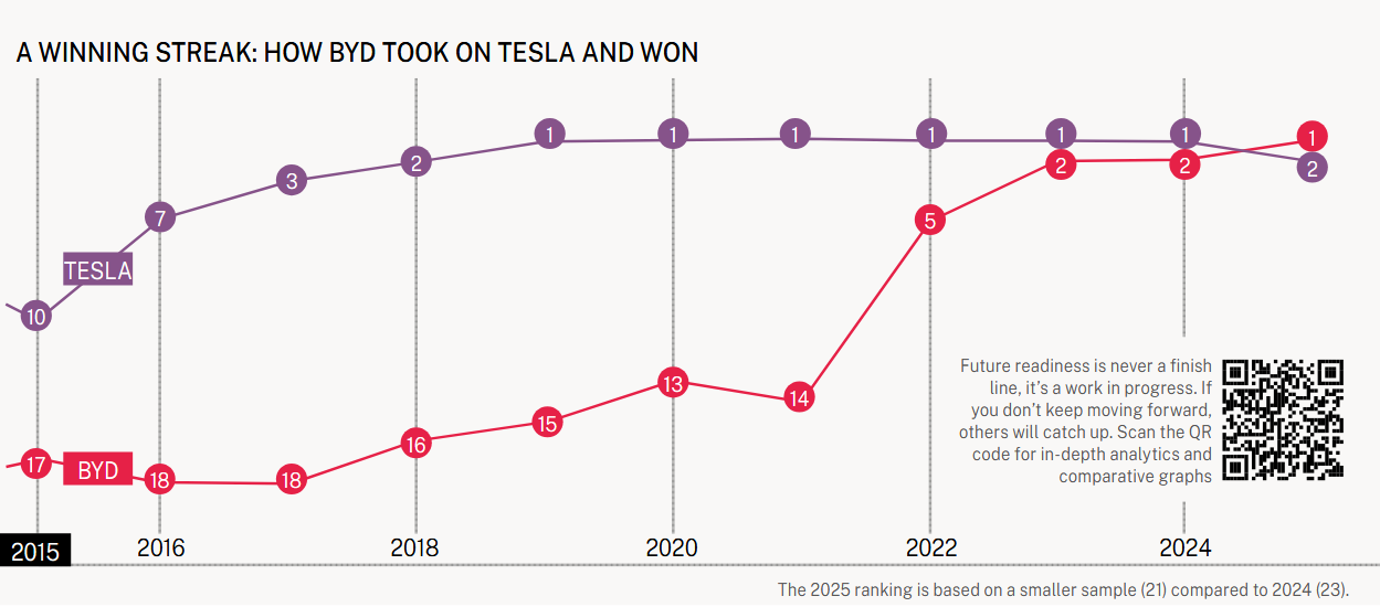 Chinese EV manufacturer BYD edged out Tesla to take the top spot in our Future Readiness ranking released in May. It came as a report showed that BYD outsold its US rival in the European market for the first time. The feat is all the more impressive given that the EU has recently imposed tariffs on Chinese-made EVs.