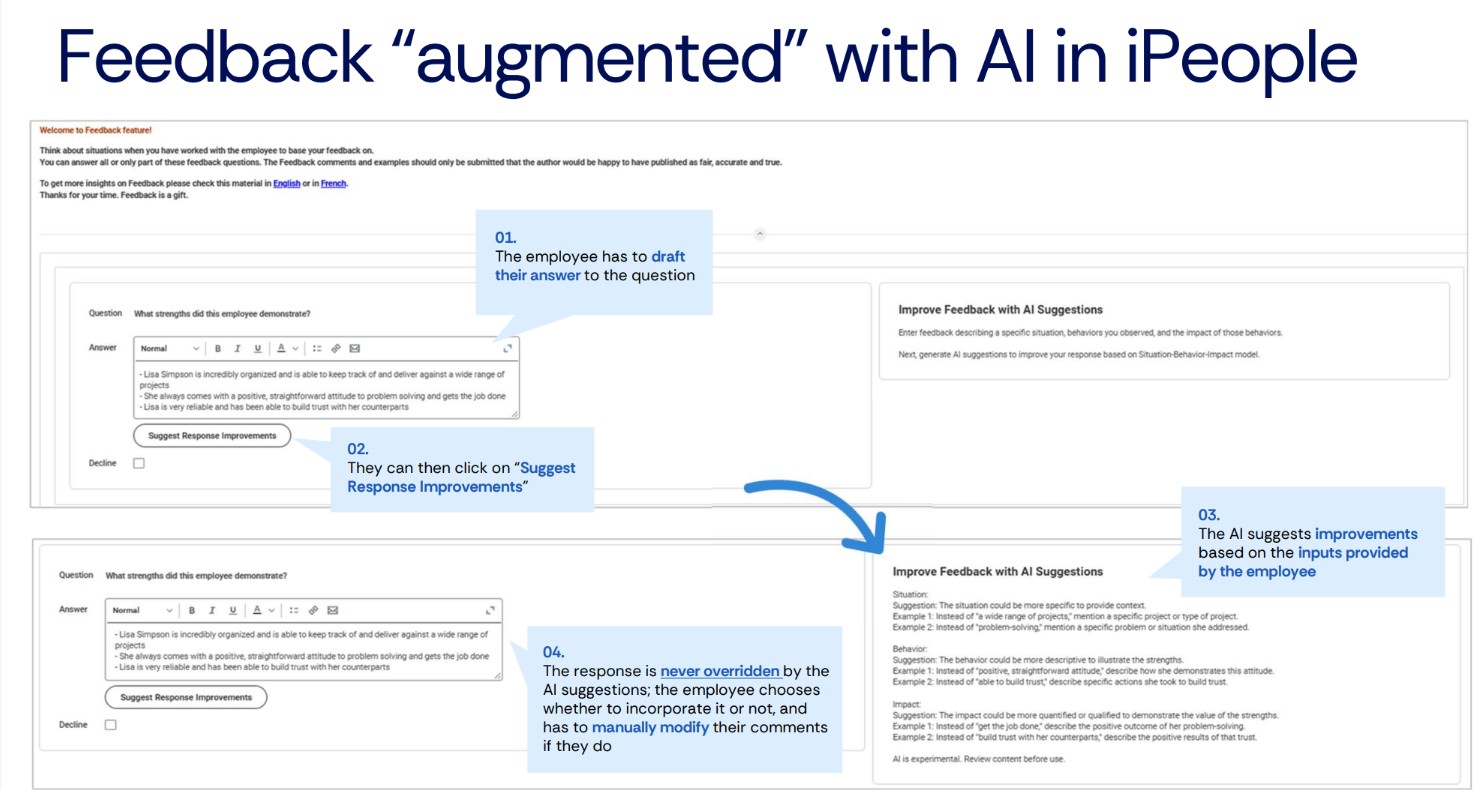 Both tools are helpful in that they model best practices in action, she adds: “They have the ability to give you constructive feedback on your feedback. So, as you’re writing your year-end reviews, and once completed, you get feedback on your feedback style. You can then challenge yourself, correct, and improve. Or, throughout the year, when you give feedback on the spot, at any time, you get these prompts in real time. It will give you context and balance: ‘this is something you’re doing well and here’s something you could improve, ’or ‘here’s where you could improve with a concrete example or a recommendation’ for behaviors and future orientation.”