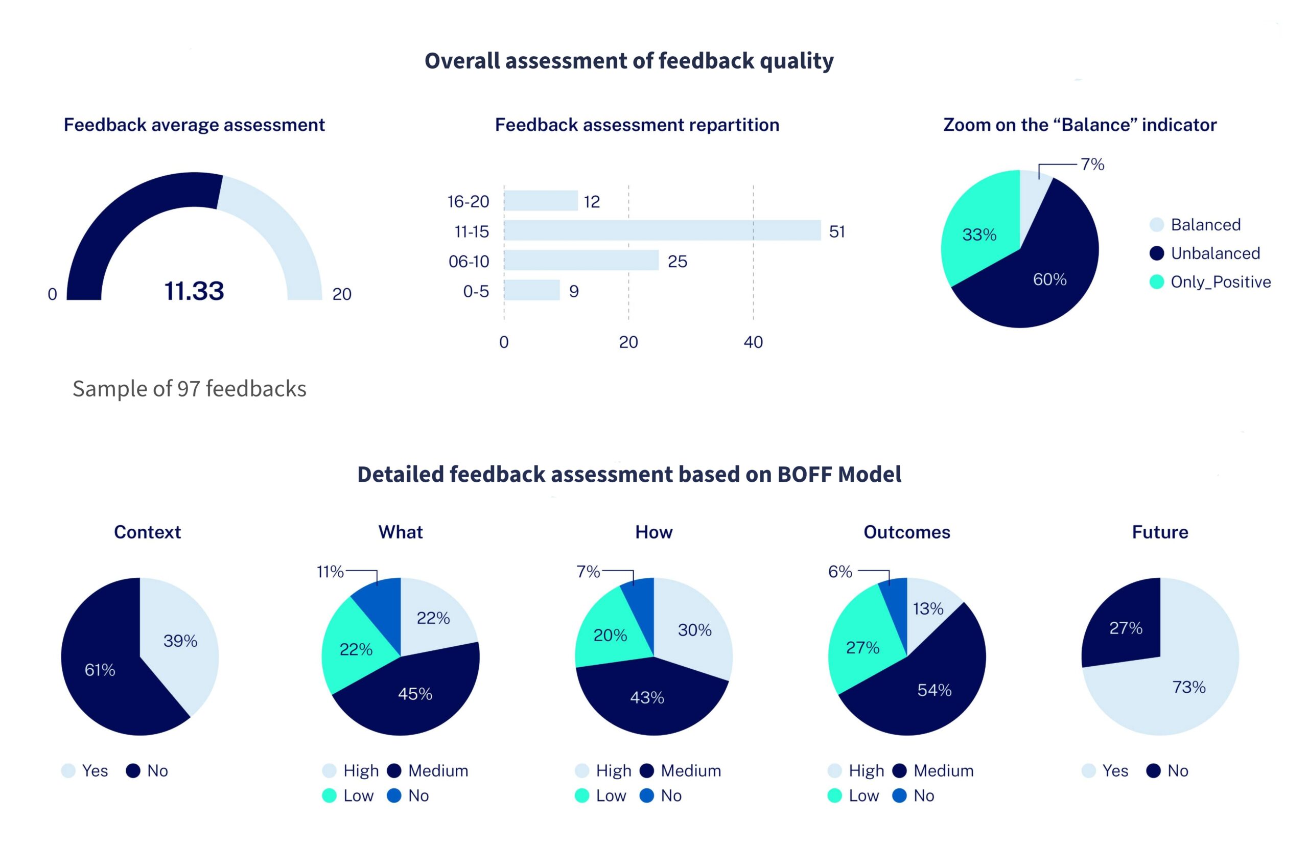 Of the 97 performance reviews analyzed, more than half scored between 11 and 15 out of 20 – which suggests that most leaders are getting the basics right. Even so, the pilot has confirmed a positivity skew in leaders’ feedback and surfaced other areas for improvement.