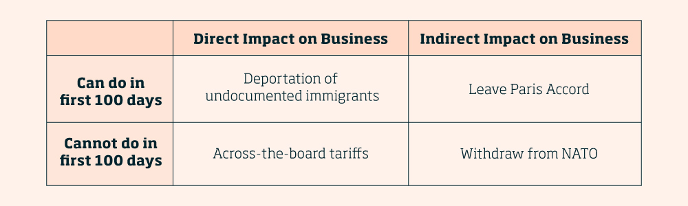 Classic enterprise risk management tools won’t be enough. Executives would do well to separate policies along two dimensions. The first dimension distinguishes actions that the new president can execute in the near term and those that – for legal or constitutional reasons – take time or require the cooperation of other independent actors, such as Congress.